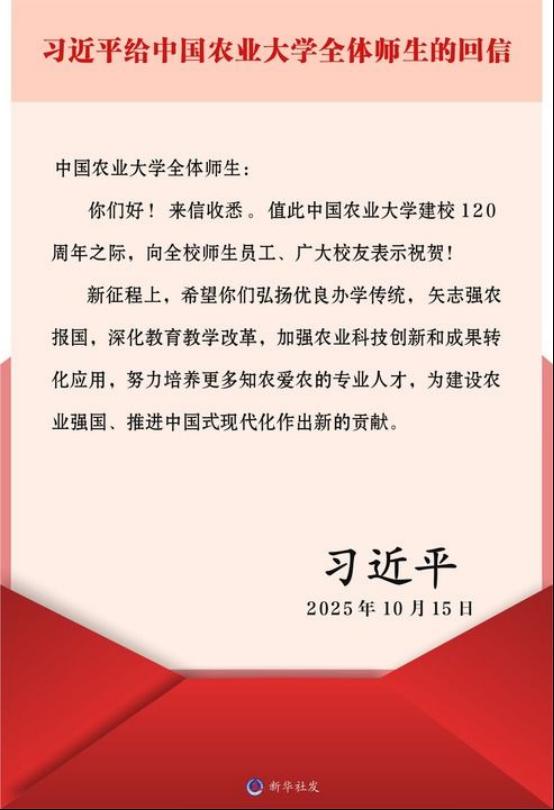 近日,中共中央总书记、国家主席、中央军委主席习近平给中国农业大学全体师生回信,在中国农业大学建校120周年之际,向全校师生员工、广大校友表示祝贺。